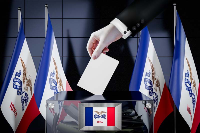 Iowa flags, hand dropping ballot card into a box – voting, elect